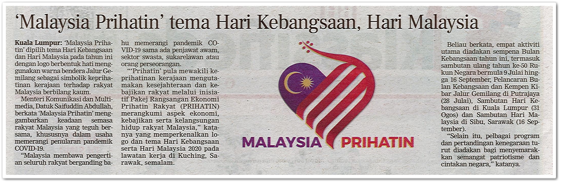 Hari ini, senin 31 agustus 2020, diperingati hari kemerdekaan malaysia. 1) apakah tema hari kemerdekaan pada tahun ini (2020) 2) malaysia terdiri dari berapa negeri? Malaysia prihatin versi koir lagu tema hari kebangsaan dan hari malaysia 2020. Bagi sambutan hari kebangsaan malaysia 2020, logo berbentuk hati dengan warna jalur gemilang diperkenalkan bersama tema yang dipilih iaitu malaysia prihatin.