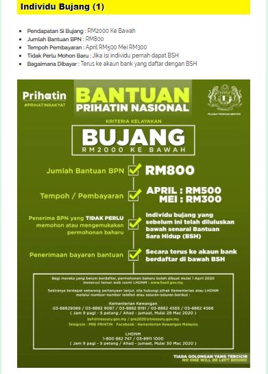 Menurut kenyataan perdana menteri pada 23 september 2020, melalui program kita prihatin kerajaan akan memberikan tambahan rm1000 untuk b40 isi rumah, rm 500 untuk b40 bujang, rm600 untuk m40 isi rumah, rm300 untuk m40 bujang.tarikh pembayaran bpn 2.0 ini akan dimasukkan pada. Syarat kelayakan, permohonan, check status dan tarikh pembayaran. Bagi individu bujang kategori b40 dan m40 yang belum pernah memohon atau gagal dalam rayuan bpn 1.0, ini merupakan peluang kedua untuk memohon bantuan prihatin nasional pada kali ini. Bantuan prihatin nasional bpn bujang :